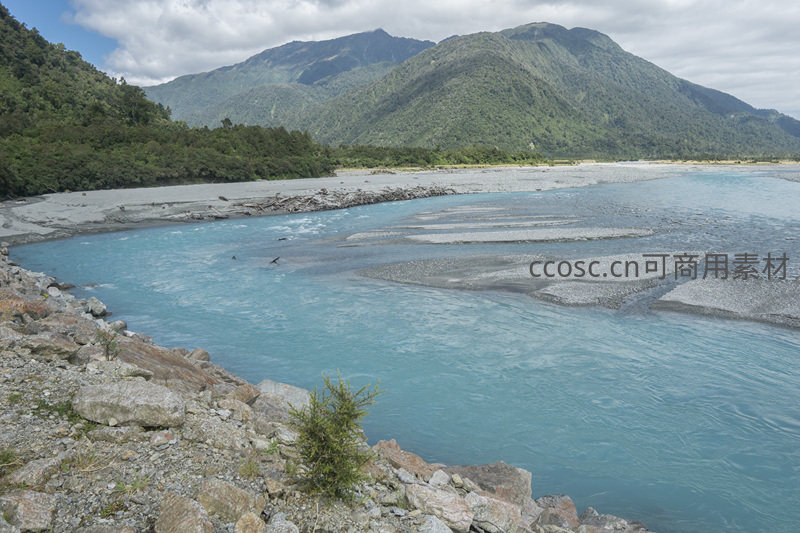 河岸边散落着大小不一的碎石,其间顽强生长着几株野草。远处山峦叠嶂,青翠欲滴,与天边的云彩相接,展现了一幅粗犷又生机勃勃的自然景象。