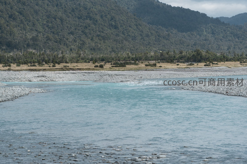 宽阔的河流在阳光下泛着微光,水流轻柔地绕过河床中的石滩,背景是层叠的深绿色山脉,整个画面简洁而富有层次感,充满自然野趣。