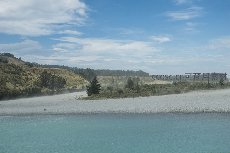 清澈的蓝色河流蜿蜒流淌,河岸雾气缭绕,远处山丘与森林相映成趣,天空湛蓝云朵飘逸,营造出宁静祥和的自然画卷。