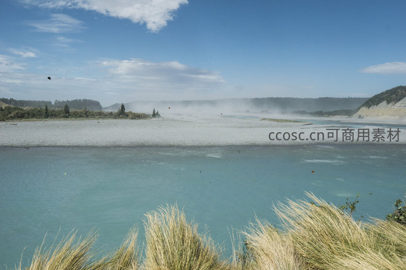 前景金黄草丛随风摇曳,中景碧蓝河水静静流淌,远处山峦隐于薄雾之中,几只飞鸟掠过晴空,构成一幅静谧而生动的自然风景。