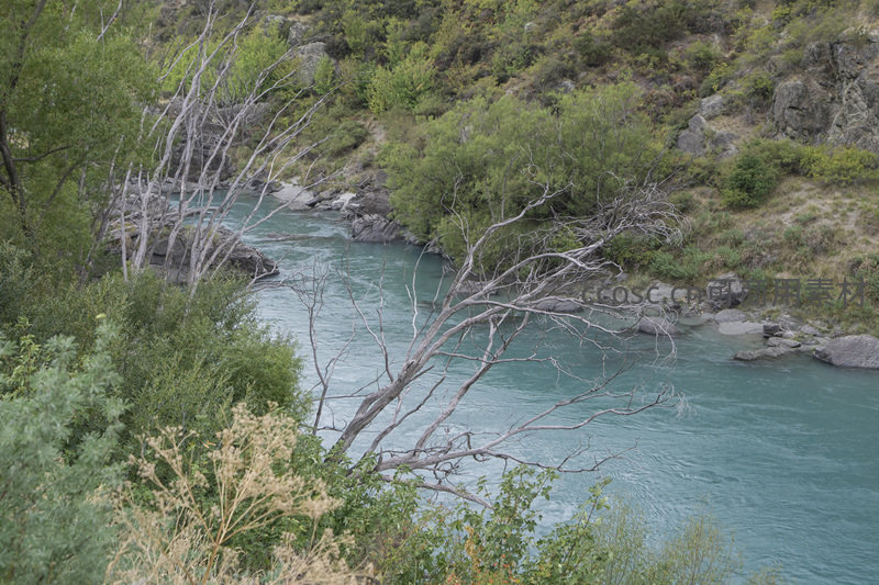 干枯的树枝伸向湍急的碧色溪流,两岸是陡峭的岩壁和茂密的灌木丛,展现出原始峡谷中野性而生动的自然景象。