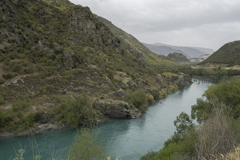 河水如丝带般穿梭于起伏的山峦之间,两岸绿意盎然,远处层叠山影与灰白天空相映,营造出悠远静谧的视觉享受。