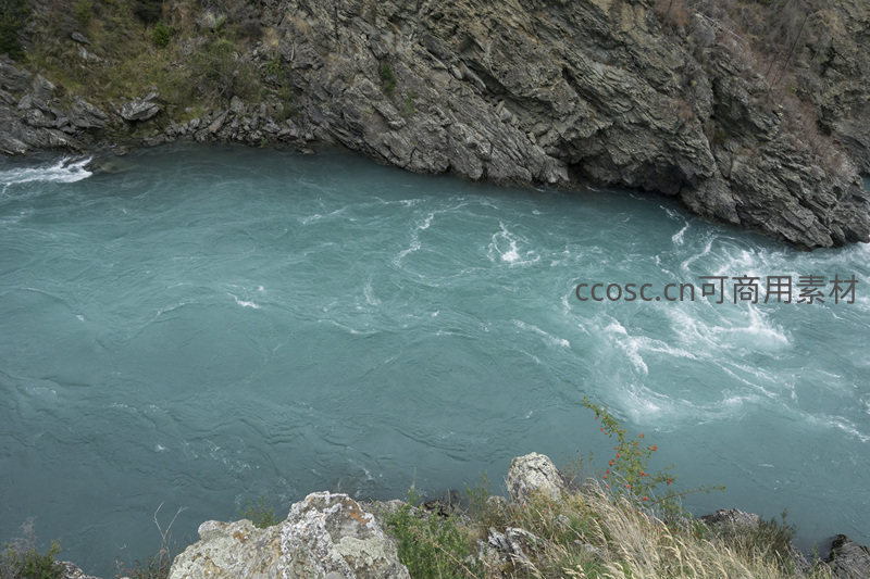清澈碧蓝的河水在嶙峋岩石间奔腾咆哮,激起层层白色浪花,展现出大自然原始而磅礴的力量与壮美。