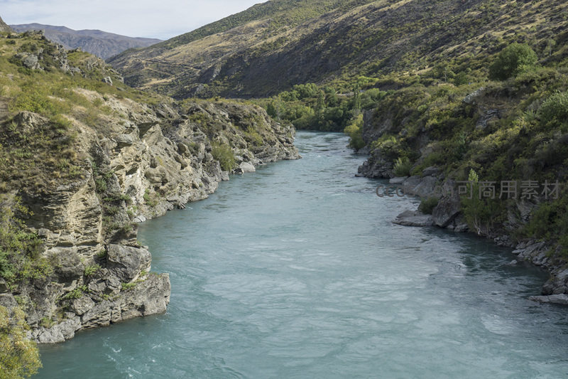 一条如玉带般的河流静静流淌在群山环抱的峡谷中,两岸植被葱郁,水面波光粼粼,尽显山水相依的和谐之美。