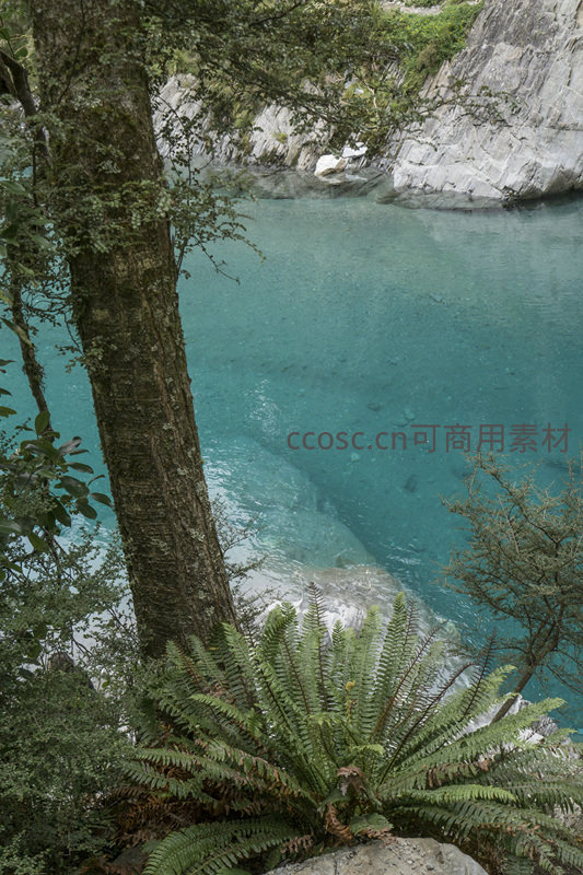 俯瞰幽深峡谷中的翡翠色潭水与蕨类植物
