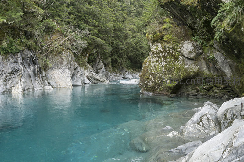 一片如宝石般碧蓝的河湾静卧于峡谷之中,两岸是覆盖着苔藓的巨大岩石和浓密的常绿树林,营造出世外桃源般的宁静意境。