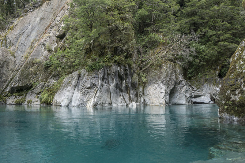 陡峭的灰白色山崖直插入碧蓝的湖水中,水面如镜,清晰倒映着崖壁与林木,阳光洒落,波光粼粼,尽显大自然的鬼斧神工。