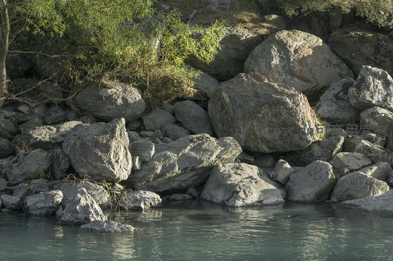 河岸巨石堆叠,绿树掩映