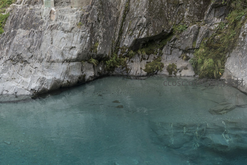 清澈见底的碧绿潭水静静流淌,倒映着陡峭的灰色岩壁。岩缝间顽强生长的绿色苔藓与蕨类植物为冷峻的石壁增添了生机,构成一幅宁静而原始的自然画卷。