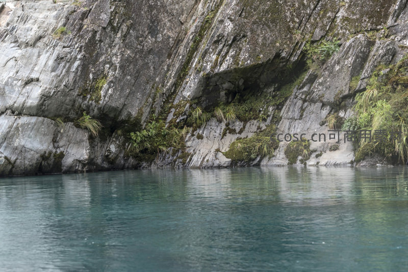 高耸的灰白色岩壁直插清澈的碧绿水中,岩壁上零星分布着顽强生长的绿色植物。水面如镜,清晰倒映着岩壁的轮廓,展现了大自然鬼斧神工与生命韧性的完美结合。