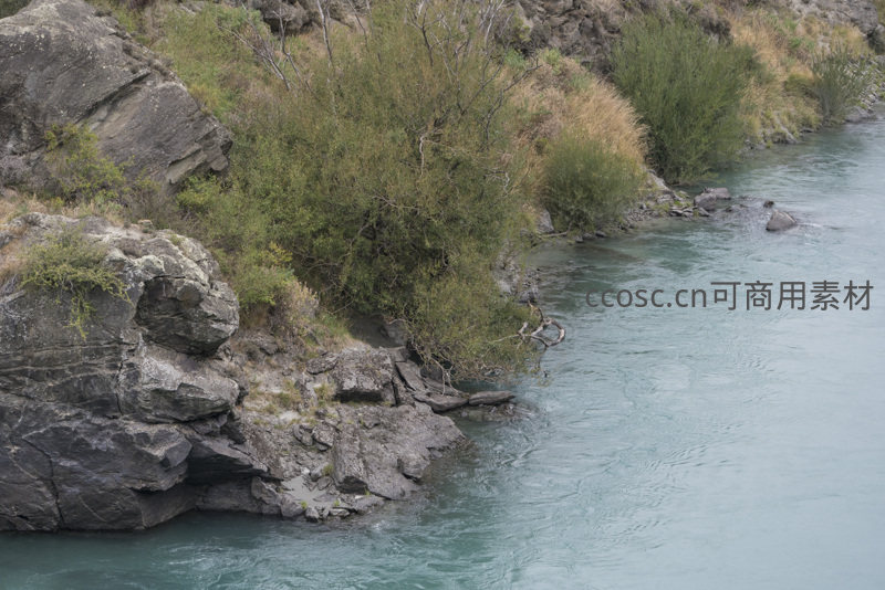 河岸由层叠岩石构成,其上覆盖着繁茂的绿色灌木丛,青色河水轻拍岸边,水纹细腻,营造出远离尘嚣的自然生态静谧画面。