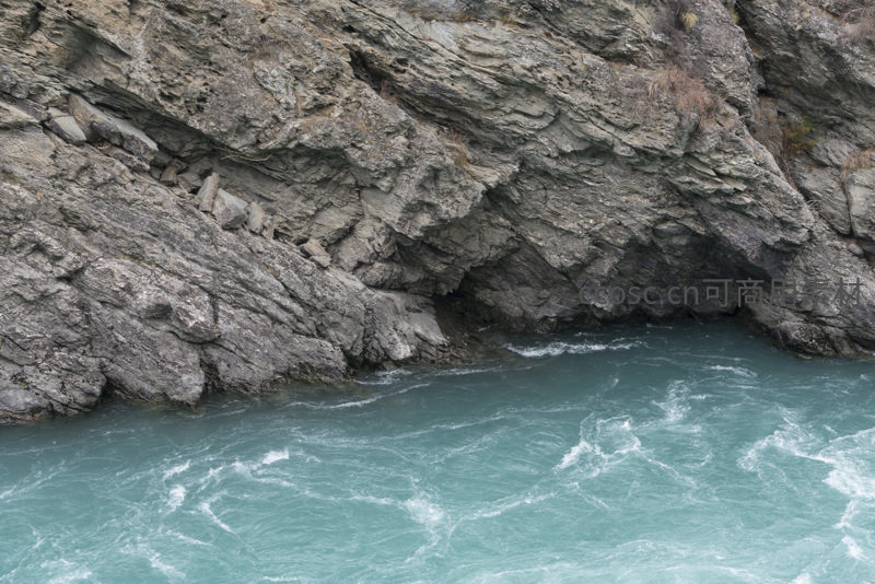 河水从巨大岩石形成的天然拱门下汹涌穿过,水面泛起白色浪花,构成一幅充满力量感的自然画卷。