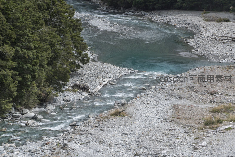 清澈的溪水在布满卵石的河床上缓缓流淌,绕过岸边茂密的树林,呈现出一派宁静祥和的自然生态景象。