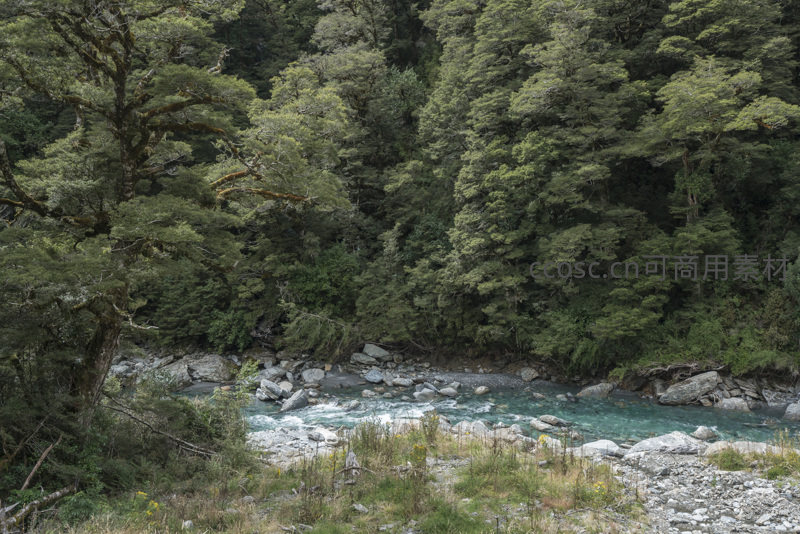 幽深的山谷中,一条碧绿的河流静静流淌,两岸是高大密集的原始森林,地面铺满碎石与野草,阳光斑驳,空气清新,是理想的自然探索与摄影胜地。