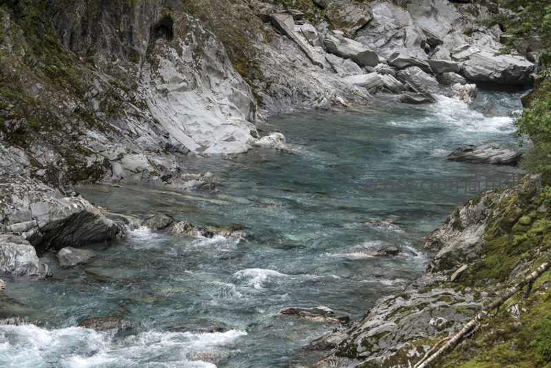 清澈的溪水在嶙峋岩石间奔涌,激起白色浪花,两岸青苔覆盖的岩壁与绿植相映,展现原始山谷的静谧与活力。