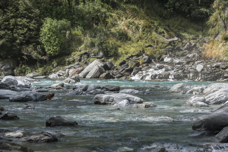 湍急的碧绿河水穿梭于大小不一的灰黑色岩石之间,背景是茂密的常绿树林,阳光透过叶隙洒落,营造出宁静而生动的自然画卷。