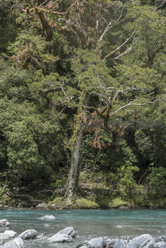 一棵苍劲古树扎根溪畔,枝干覆满青苔,根部盘踞于湿润石岸,清澈溪水倒映着葱郁林木,传递出岁月沉淀的自然之美。