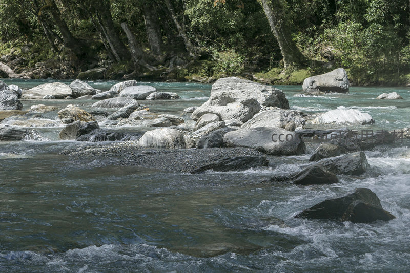 湍急的溪水猛烈冲击着河床中的巨大岩石,激起无数白色水花,背景是茂密的绿色森林,整个画面充满自然的力量感与原始野性。