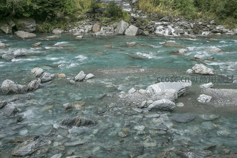 一条碧绿色的河流蜿蜒流淌,河水清澈见底,温柔地穿行在大小不一的灰白色卵石与沙砾之间,两岸绿树成荫,构成一幅宁静的山水画卷。