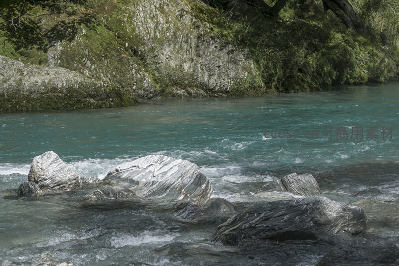 碧蓝河水绕石而行,波光粼粼如镜面