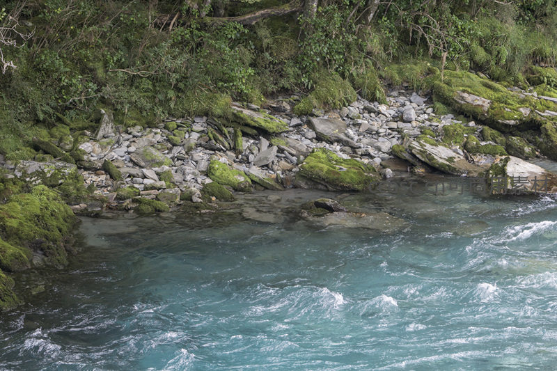 河岸上布满厚实青苔的碎石与大石错落有致,清澈水流轻抚其上,泛起微澜,整幅画面洋溢着湿润清新的自然气息与静谧氛围。