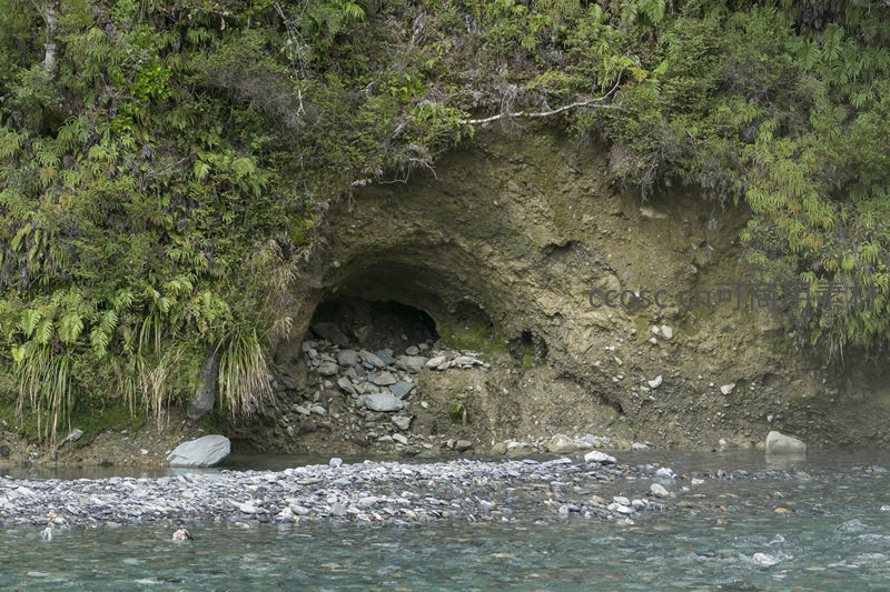 河岸边一处天然形成的土黄色岩洞半掩在茂盛的蕨类植物和灌木丛中,洞口散落着碎石,前方是缓缓流动的浅水区。此景充满神秘感,仿佛是未被开发的原始秘境等待探索。