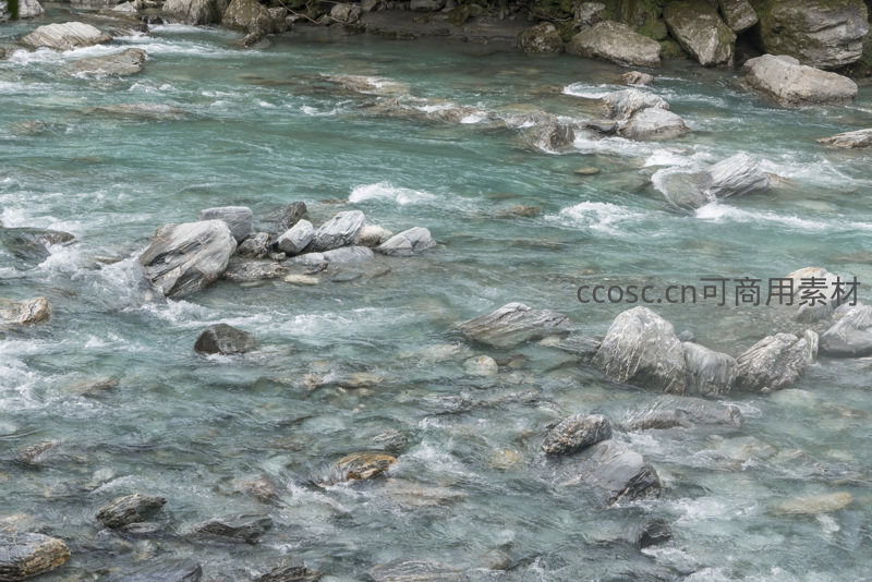 近距离捕捉水流冲刷岩石的瞬间,透明的碧蓝色河水在灰色岩块间穿梭,水花飞溅,光影交错,展现水与石碰撞的细腻质感与动感。