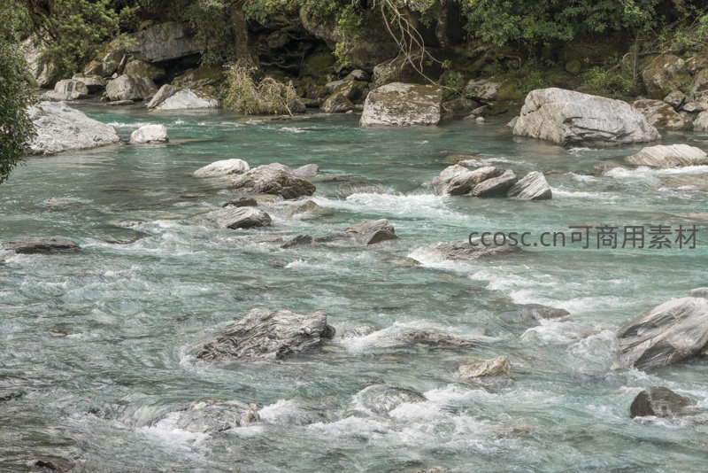 湍急的河水在灰色巨石间穿梭激荡,形成层层白色浪花,背景是郁郁葱葱的林木,构成一幅动感十足的自然画卷。