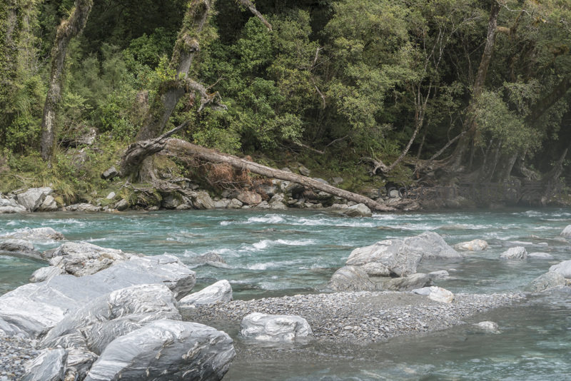 一棵巨大的倒木横卧于湍急溪流之上,根系裸露,周围是茂密原始森林,展现了大自然未经雕琢的野性与生命力。