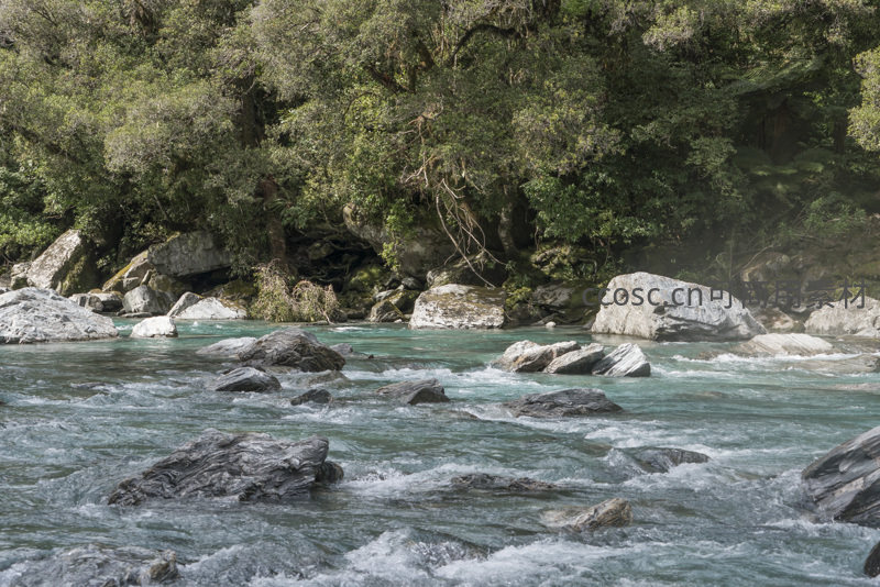 河水在嶙峋乱石间奔腾跳跃,激起朵朵白色浪花,背景是茂密的原始森林,展现出大自然力量与柔美的完美交融。