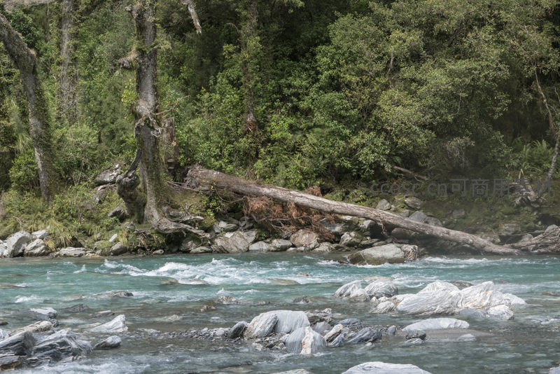 清澈的蓝绿色溪流在嶙峋怪石间奔腾,两岸古树参天,苔藓覆地,倒木横陈,展现出原始森林中生机勃勃的自然景象。