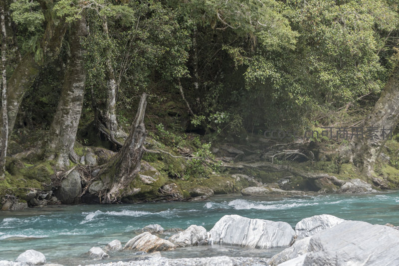 湍急的溪水轻抚着布满青苔的河岸,古老树木的根系如龙爪般紧抓岩石,构成一幅宁静而充满生命力的山林溪谷图景。