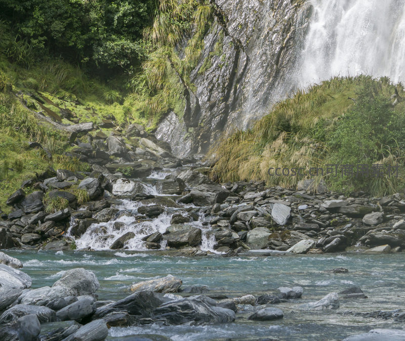 高处瀑布如白练般倾泻而下,落入布满湿滑岩石的溪谷,水雾弥漫,滋润着岸边青翠苔藓与草丛,展现原始山野的壮丽与生机。