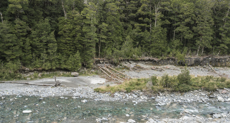 浅水区裸露的沙土与倒伏的枯木形成独特地貌,后方是层叠的密林,展现了自然力量雕琢下的原始河谷风貌。