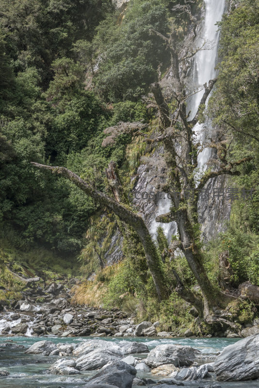 一道壮观的瀑布从高耸的岩壁上飞流直下,水雾弥漫。前景中一棵苍劲的古树斜伸入湍急的溪流,周围是茂密的原始森林和嶙峋的河床石块。