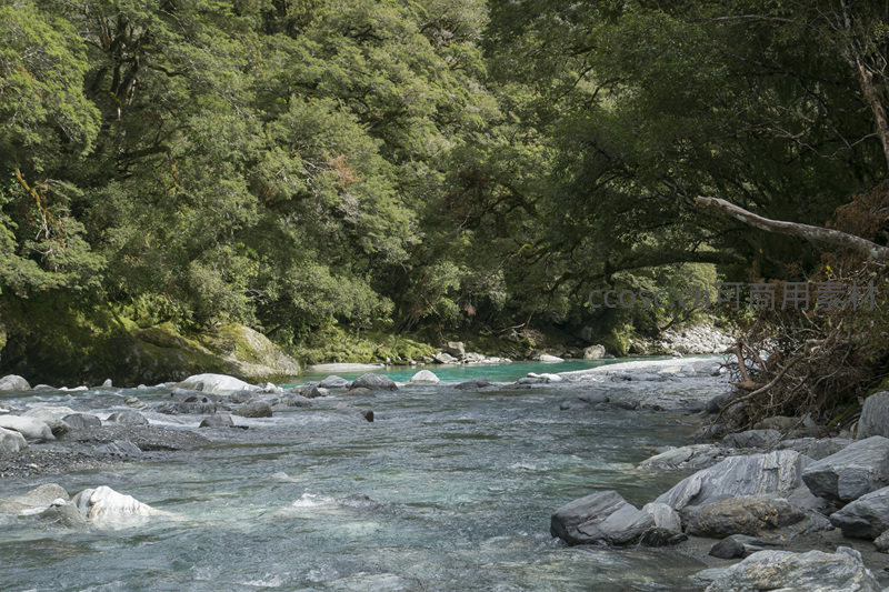 阳光透过浓密树冠洒落,清澈见底的溪水在圆润石块间轻柔流淌,营造出一片清凉、宁静的夏日森林秘境。