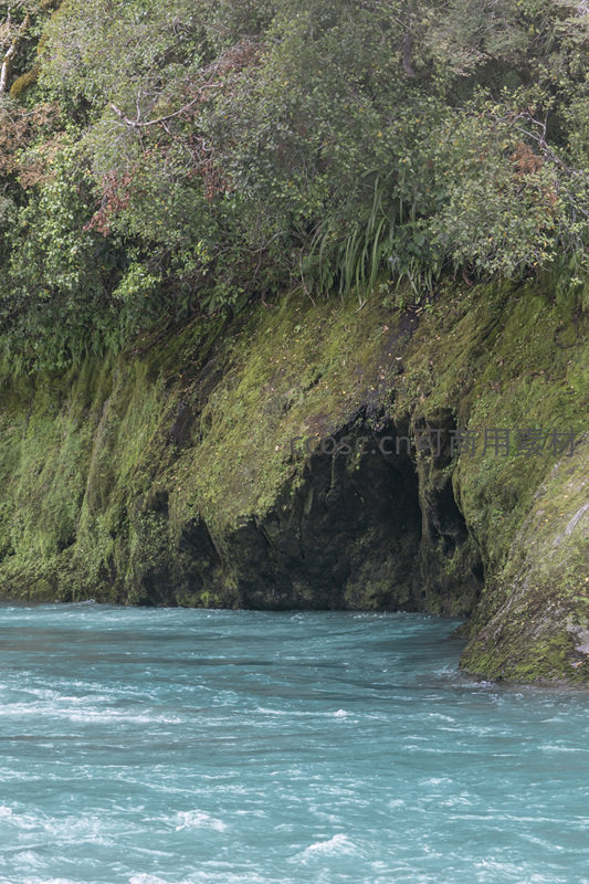 湍急的河水冲击着长满苔藓的河岸,上方是茂密的森林,构成一幅充满动感与生机的自然画卷。