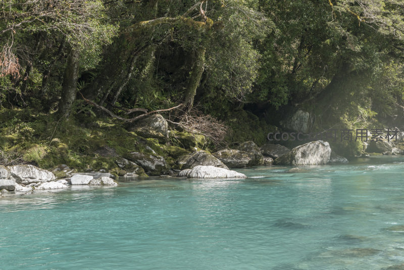 清澈见底的碧水轻抚着岸边的白色岩石,背景是浓密的树林,阳光透过树叶洒下斑驳光影,充满自然野趣。
