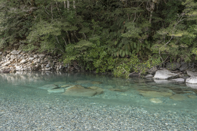 溪水如琉璃般透明,河床遍布大小不一的圆润石子,岸边树木郁郁葱葱,水面倒映着枝叶,构成一幅纯净无瑕的自然生态图景。