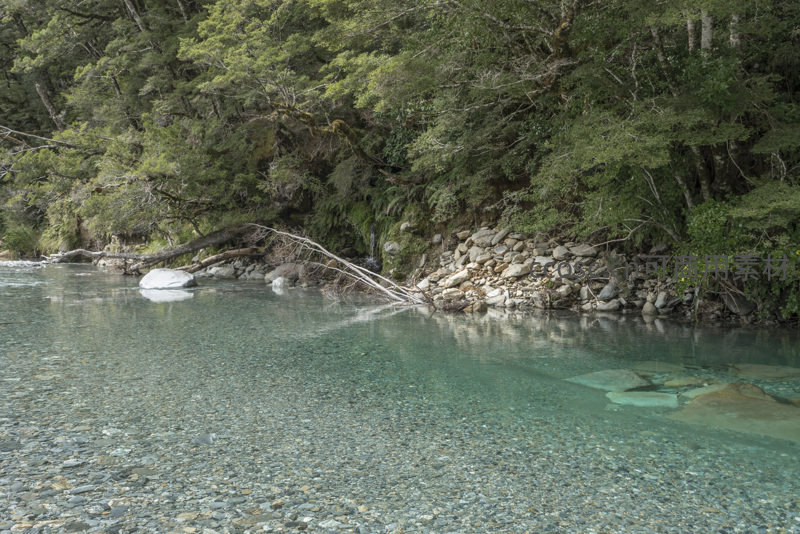 阳光透过树冠洒落在清澈的溪水上,水底的砾石与沙粒纹理分明,岸边散落枯木与岩石,展现出原始森林中溪流的静美与生机。