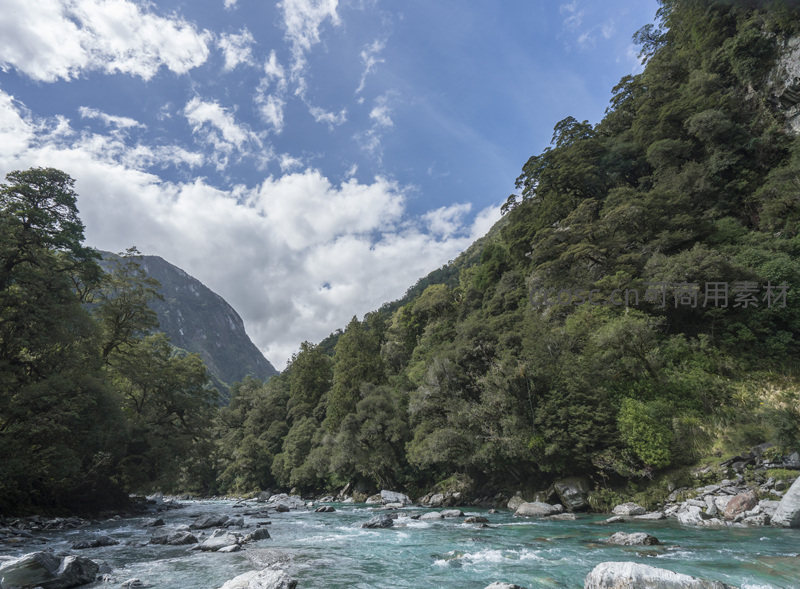 清澈的溪流在郁郁葱葱的山谷中蜿蜒流淌,两岸绿树成荫,远处山峰巍峨,天空湛蓝白云朵朵,构成一幅宁静壮丽的自然画卷。