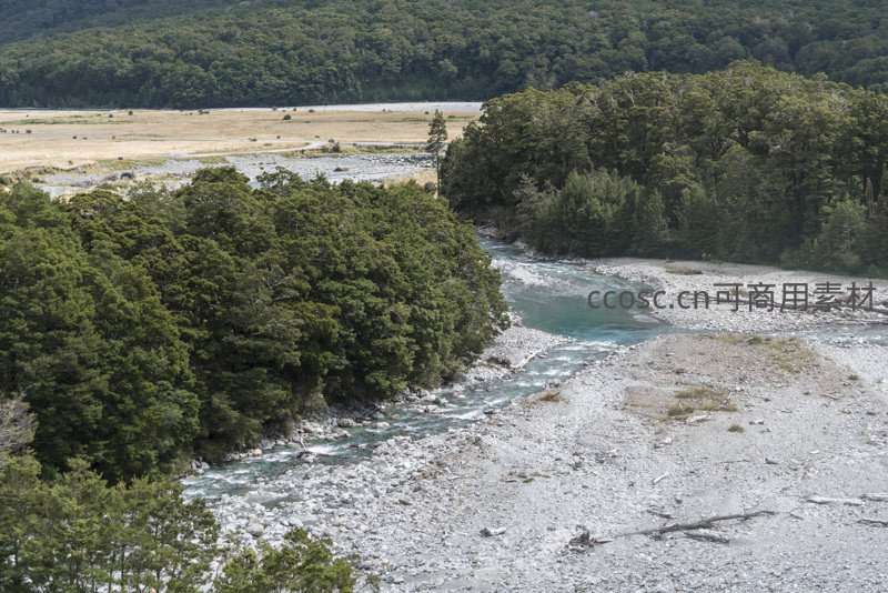 从高空俯瞰,一条碧绿溪流如丝带般穿梭于广袤的河谷平原之间,两岸密林环绕,河床遍布卵石,展现原始地貌的壮阔与和谐。
