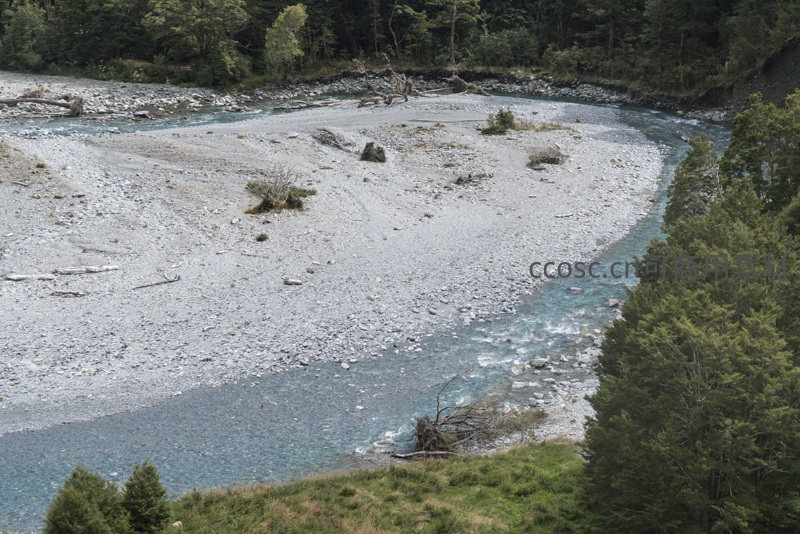 弯曲的河湾形成天然浅滩,水流轻缓,岸边绿树成荫,散落枯木与碎石,营造出远离尘嚣的静谧生态景观,令人心旷神怡。