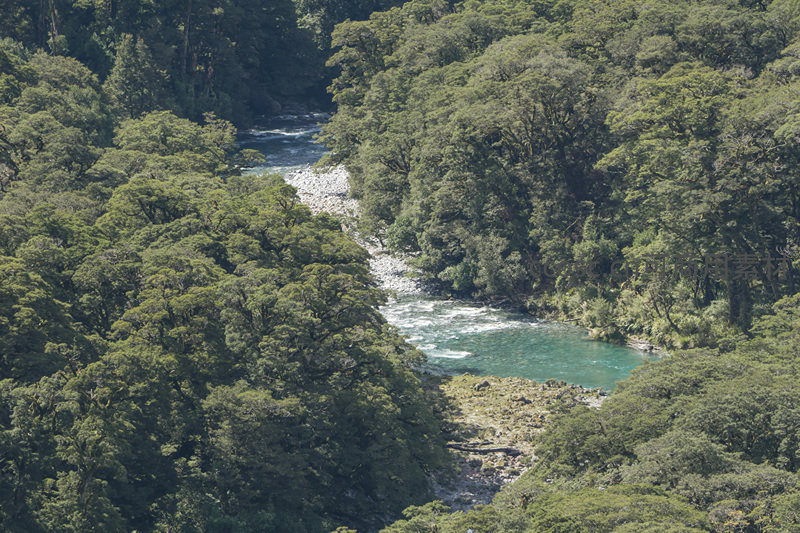 从高空俯瞰,一条清澈的碧绿河流蜿蜒穿行于茂密的原始森林峡谷之间,阳光洒落,水光潋滟,尽显大自然的壮丽与宁静。