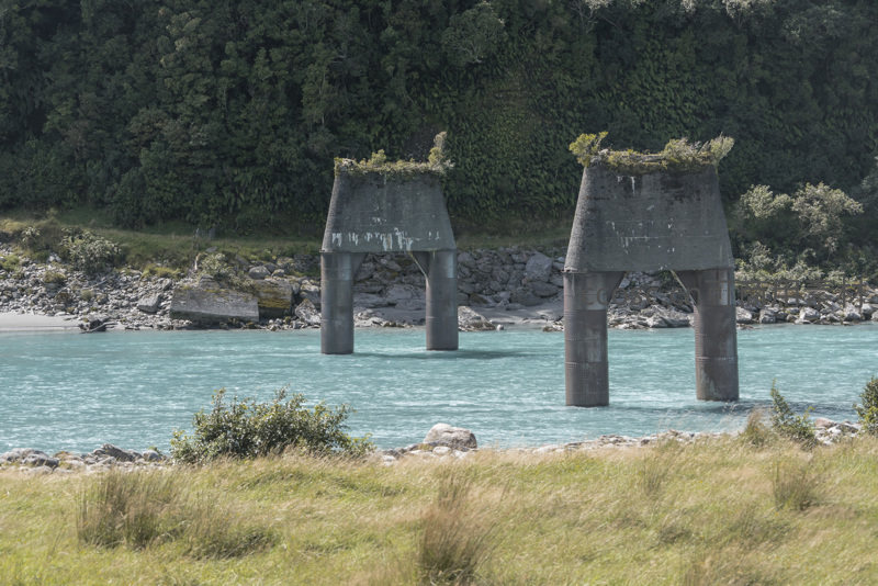 两座被岁月侵蚀的混凝土桥墩静立于湍急的碧绿河水中,顶部覆盖着青苔和野草,背景是茂密森林,展现人与自然交融的沧桑之美。