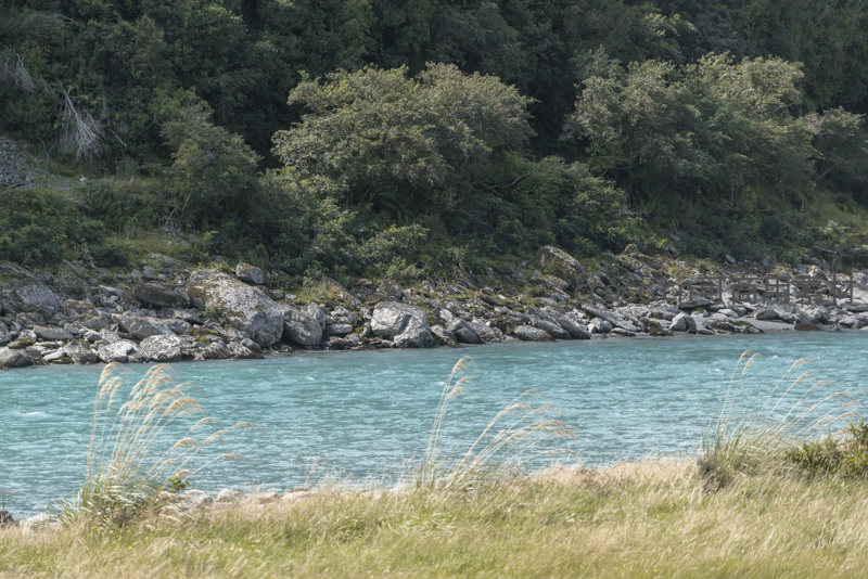 清澈的河水缓缓流过布满大小石块的河岸,前景中金黄色的芦苇随风轻舞,后方是郁郁葱葱的灌木丛,构成一幅宁静和谐的自然画卷。