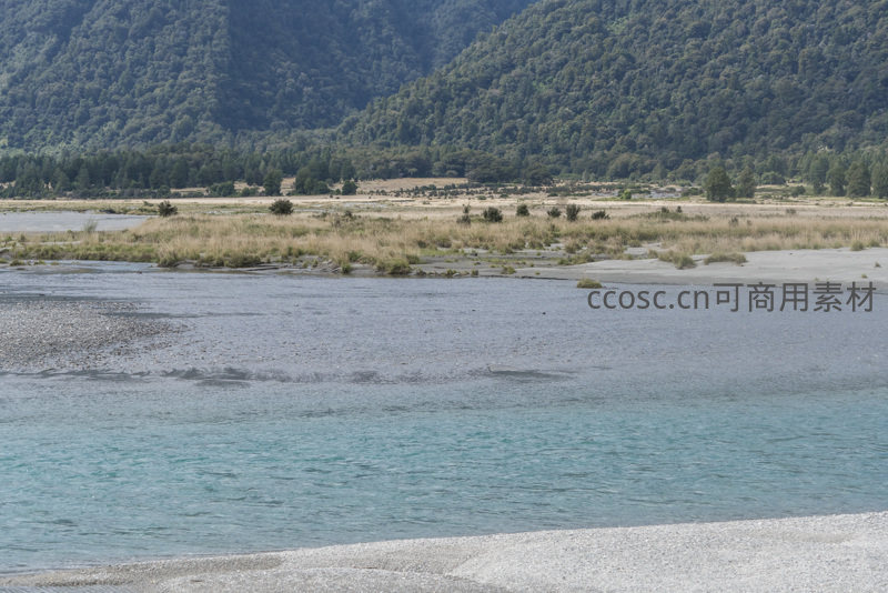 远处苍翠的山峦环抱开阔的河谷,浅蓝色的河水蜿蜒流淌,两岸是沙质滩涂与稀疏草地,展现出壮阔而平和的自然地理风貌。