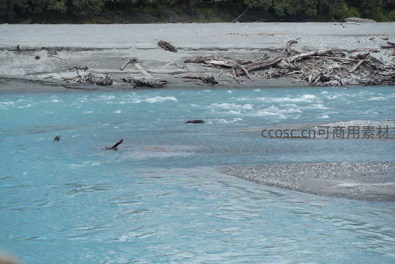 湍急的蓝绿色河水冲刷着岸边堆积的枯木与光滑卵石,水花四溅,充满动感,展现了河流原始野性与自然力量交织的生动画面。