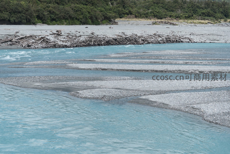清澈的蓝绿色河水奔腾流淌,冲刷着河床中星罗棋布的灰色石滩,远处青山环绕,构成一幅壮丽的自然画卷。