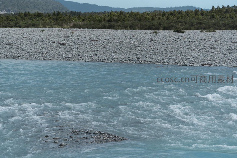 清澈的蓝色河水在布满卵石的河床上奔流不息,激起层层白色浪花。远处青山连绵,近岸绿树成荫,构成一幅宁静而充满力量的自然画卷。